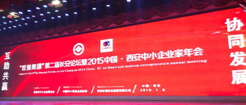 中國中小商業(yè)企業(yè)協(xié)會微信公眾號士達(dá)、劉微:2016年1月8日,由中國中小商業(yè)企業(yè)協(xié)會指導(dǎo),西安市中小企業(yè)聯(lián)合會主辦的第二屆《長安論壇》暨2015中國·西安中小企業(yè)家年會在西安大唐西市酒店金色大廳盛大舉行,主題為2016中國經(jīng)濟(jì)形勢分析暨互聯(lián)網(wǎng)時代的中小企業(yè)發(fā)展思路。此次年會由陜西世強(qiáng)實(shí)業(yè)集團(tuán)有限公司冠名支持。這是一場由金融專家、名企領(lǐng)袖、互聯(lián)網(wǎng)大咖、各地商會、近1100位企業(yè)代表共同締造的財富資本盛宴。