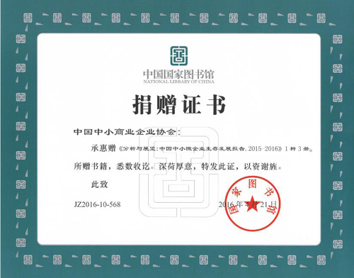 4月21日,中國中小商業(yè)企業(yè)協(xié)會(huì)向國家圖書館捐贈(zèng)《分析與展望:2015-2016中國中小微企業(yè)發(fā)展報(bào)告》一書。國圖工作人員對(duì)我會(huì)的捐贈(zèng)表示衷心感謝,并向我會(huì)頒發(fā)了國家圖書館捐贈(zèng)證書。