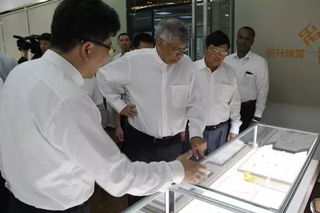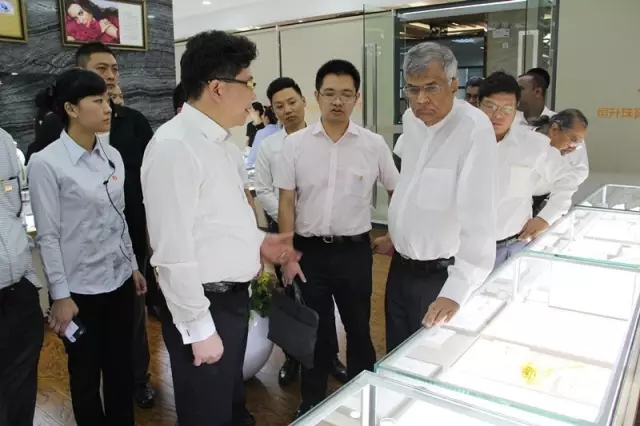 拉尼爾·維克拉馬辛哈總理一行參觀曙光恒升珠寶加工基地。汪主任介紹了基地利用黃金、鉆石、彩寶等加工情況。