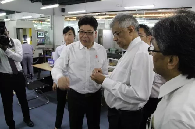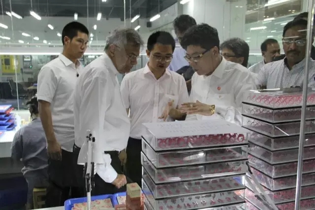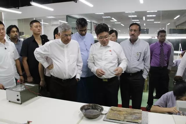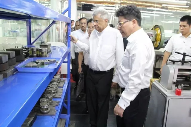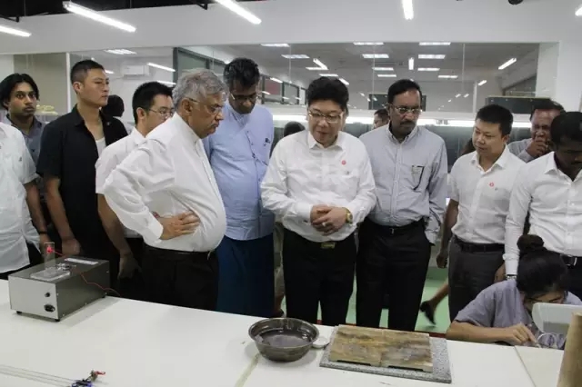 在自動(dòng)化CNC生產(chǎn)產(chǎn)品車間,汪總對(duì)產(chǎn)品工藝進(jìn)行介紹,拉尼爾·維克拉馬辛哈總理一行對(duì)工廠的產(chǎn)品仔細(xì)觀摩并與隨行人員討論。