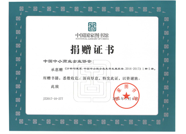 3月7日,中國中小商業(yè)企業(yè)協(xié)會向國家圖書館捐贈《分析與展望:2016-2017中國中小微企業(yè)發(fā)展報告》一書。國圖工作人員對我會的捐贈表示衷心感謝,并向我會頒發(fā)了國家圖書館捐贈證書。