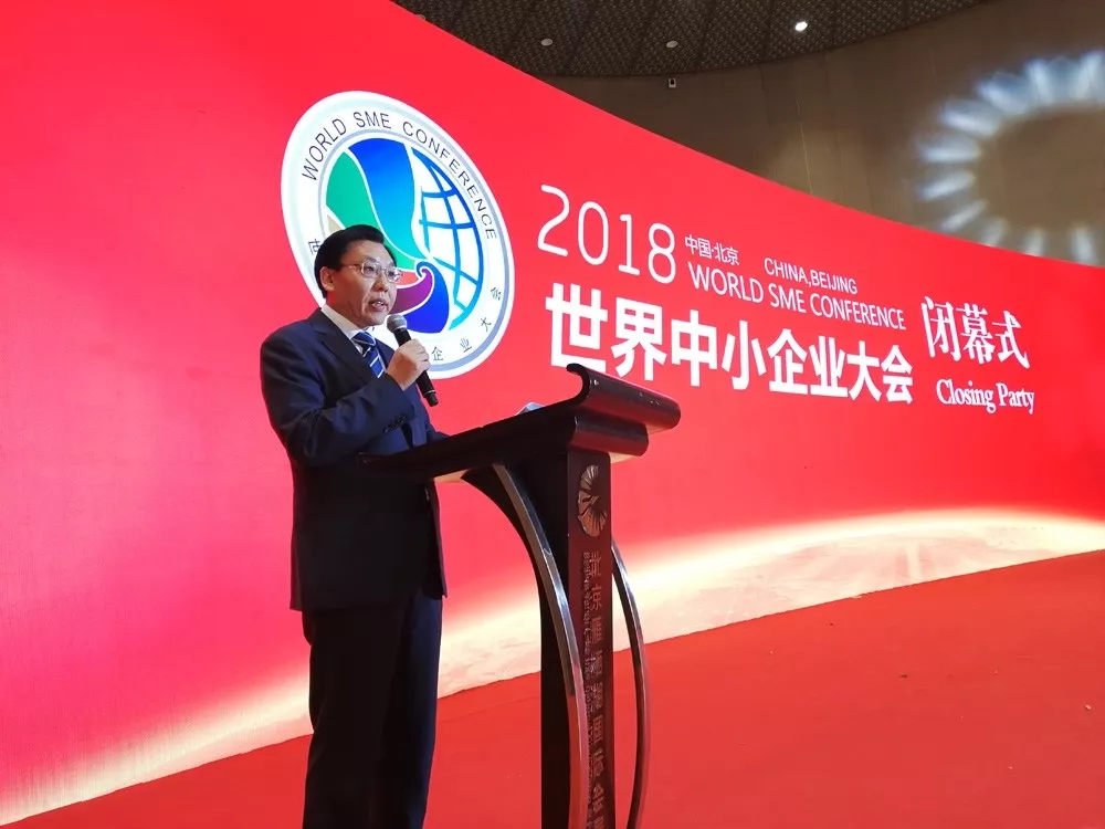 中國(guó)中小商業(yè)企業(yè)協(xié)會(huì)會(huì)長(zhǎng)王民在2018世界中小企業(yè)大會(huì)上致閉幕詞