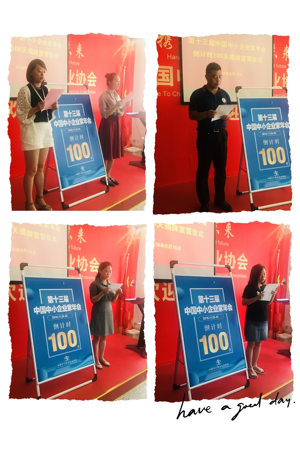 8月15日上午,中國(guó)中小商業(yè)企業(yè)協(xié)會(huì)舉辦了2018第十三屆中國(guó)中小企業(yè)家年會(huì)倒計(jì)時(shí)100天揭牌宣誓儀式。協(xié)會(huì)副會(huì)長(zhǎng)鮑鑫毳及各部門(mén)、分支機(jī)構(gòu)代表共同為第十三屆中國(guó)中小企業(yè)家年會(huì)倒計(jì)時(shí)100天揭牌。協(xié)會(huì)各部門(mén)、分支機(jī)構(gòu)代表圍繞年會(huì)事宜分別宣讀年會(huì)工作誓言。年會(huì)人滿懷激情,以昂揚(yáng)斗志、務(wù)實(shí)態(tài)度、無(wú)所畏懼和挑戰(zhàn)極限的精神,以不忘初心再出發(fā)、抓好轉(zhuǎn)型促升級(jí),做好企業(yè)服務(wù)助發(fā)展的理念,編寫(xiě)年會(huì)華麗新篇章。倒計(jì)時(shí)100天的揭牌與工作誓言的宣讀也意味著第十三屆年會(huì)步入緊張的籌備工作階段。