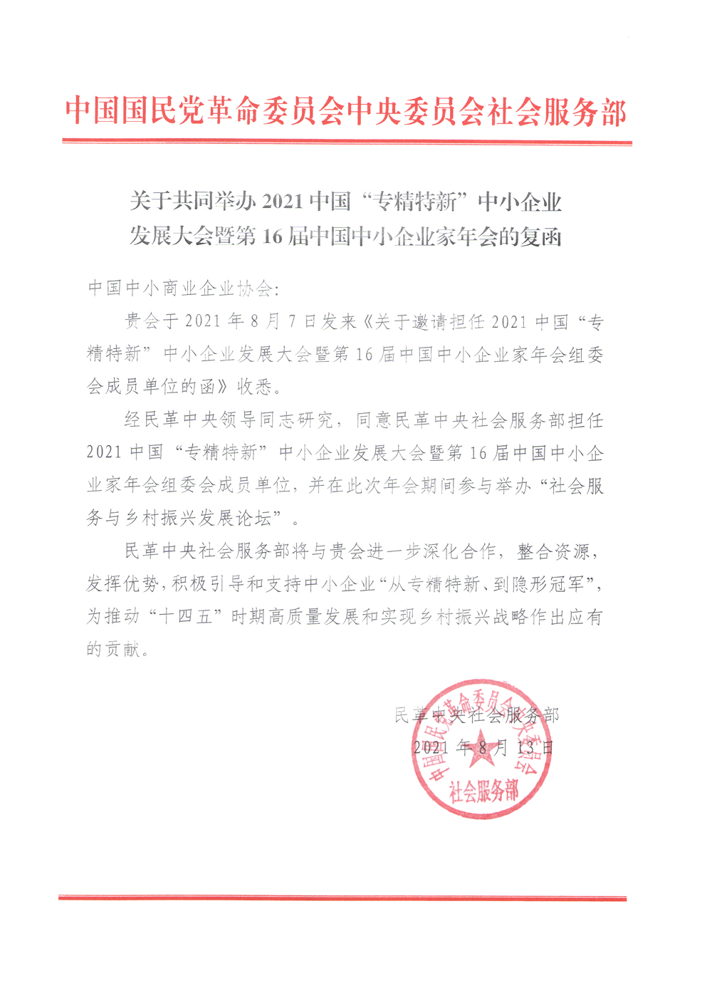 近日,中國國民黨革命委員會中央委員會社會服務(wù)部回函,確認擔(dān)任2021中國“專精特新”中小企業(yè)發(fā)展大會暨第16屆中國中小企業(yè)家年會組委會成員單位,并在此次年會期間參與舉辦“社會服務(wù)與鄉(xiāng)村振興發(fā)展論壇”。