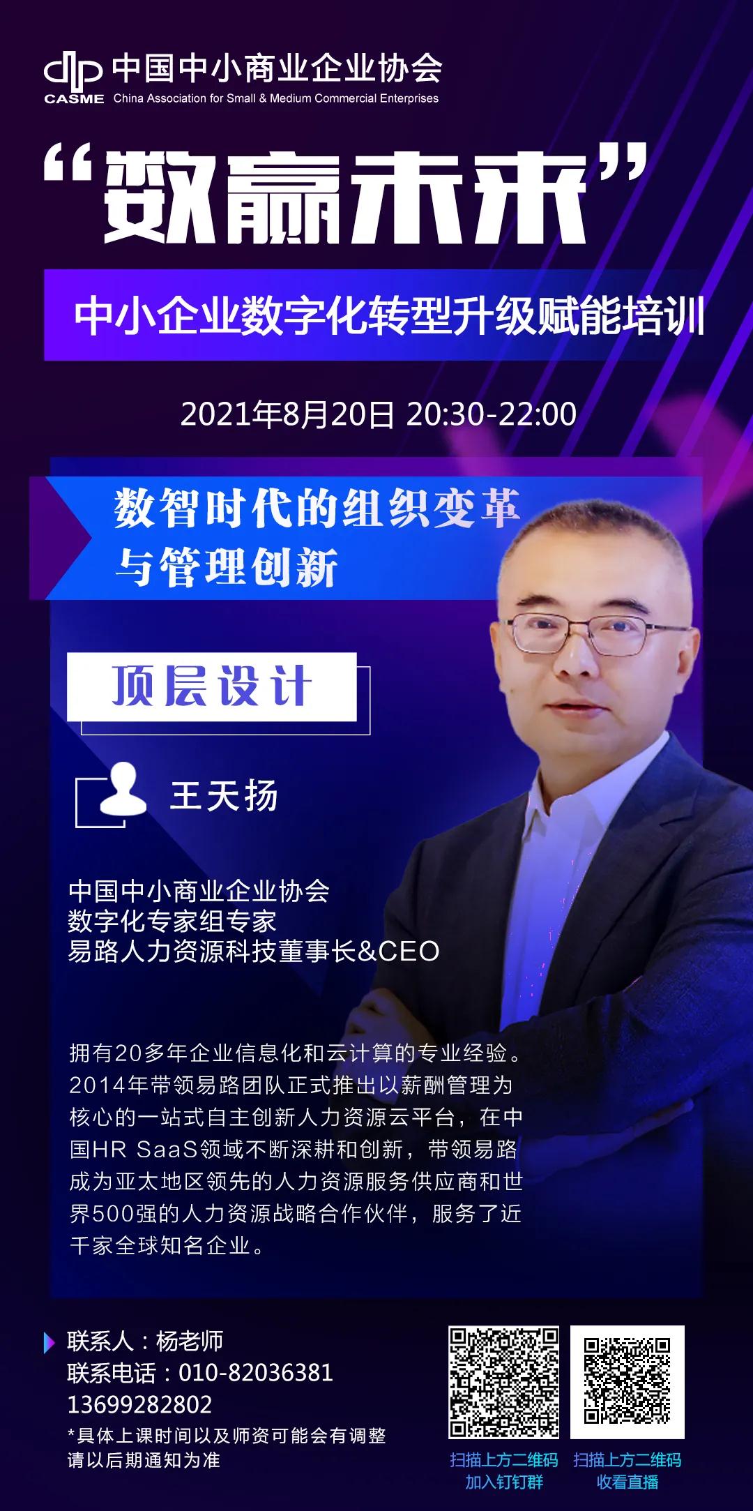 8月20日晚20:30,由中國中小商業(yè)企業(yè)協(xié)會主辦的“數(shù)贏未來”中小企業(yè)數(shù)字化轉(zhuǎn)型升級賦能線上培訓班第三課在釘釘平臺準時開課。本次課程由中國中小商業(yè)企業(yè)協(xié)會數(shù)字化專家組專家、易路人力資源科技董事長&CEO王天揚老師講授,協(xié)會數(shù)字化專家組組長、數(shù)字化轉(zhuǎn)型戰(zhàn)略專家阮開利總結(jié),協(xié)會會長助理許湘主持。