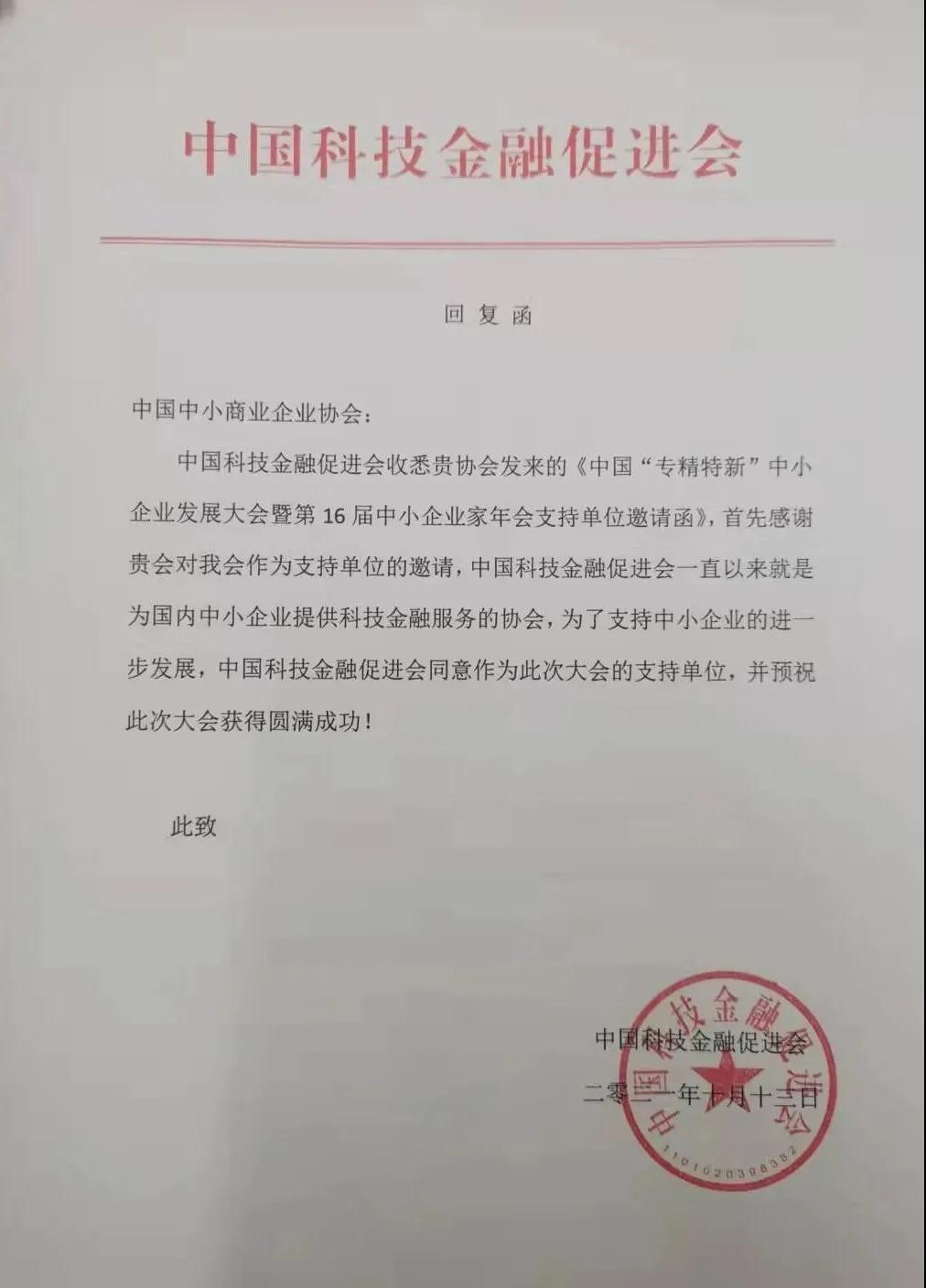 近日,中國(guó)科技金融促進(jìn)會(huì)回函,確認(rèn)擔(dān)任2021中國(guó)“專精特新”中小企業(yè)發(fā)展大會(huì)暨第16屆中國(guó)中小企業(yè)家年會(huì)支持單位。
