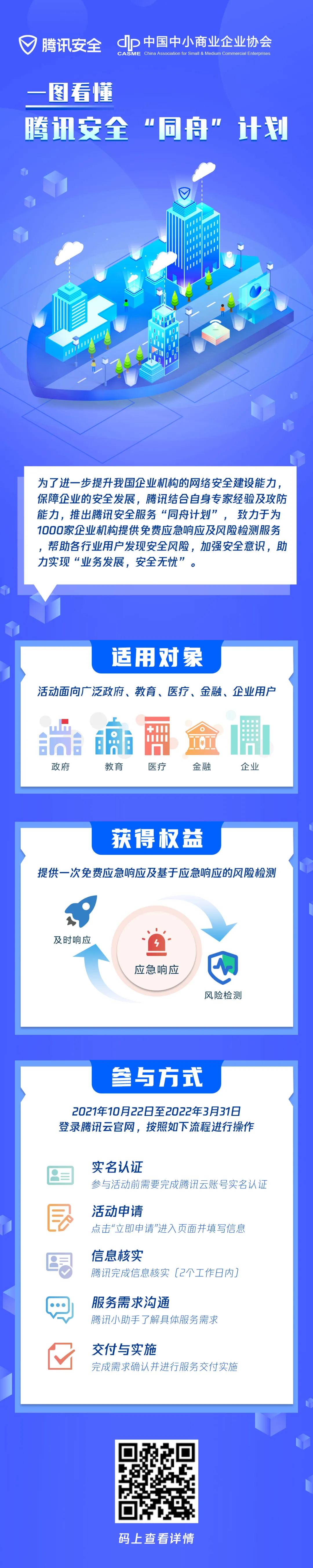針對(duì)于中小企業(yè)缺乏人力和預(yù)算來(lái)做安全建設(shè),安全投入和企業(yè)發(fā)展難以兼顧的狀況,10月22日,中國(guó)中小商業(yè)企業(yè)協(xié)會(huì)攜手騰訊安全共同啟動(dòng)“同舟計(jì)劃”。致力于為1000家企業(yè)機(jī)構(gòu)提供免費(fèi)應(yīng)急響應(yīng)及風(fēng)險(xiǎn)檢測(cè)服務(wù),幫助眾多中小企業(yè)補(bǔ)齊安全建設(shè)短板,提升安全防線,護(hù)航中小企業(yè)發(fā)展。中國(guó)中小商業(yè)企業(yè)協(xié)會(huì)名譽(yù)會(huì)長(zhǎng)董樹(shù)奎、監(jiān)事長(zhǎng)左凌云,騰訊安全副總裁董志強(qiáng)、總經(jīng)理程文杰等共同啟動(dòng)。