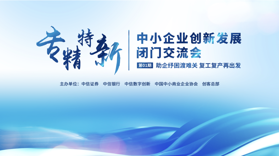 近日,由中國中小商業(yè)企業(yè)協(xié)會聯(lián)合中信證券、中信銀行、中信數(shù)字創(chuàng)新公司、創(chuàng)客總部共同舉辦的“專精特新中小企業(yè)創(chuàng)新發(fā)展閉門交流會”第01期圓滿收官。會議以“助企紓困渡難關(guān),復(fù)工復(fù)產(chǎn)再出發(fā)”為主題,共同邀請30余位專精特新等中小企業(yè)高管,與政策解讀權(quán)威專家、央企高管“云聚”一堂,共同分享、解讀專精特新最新培育政策,探討融資關(guān)鍵痛難點,為中小企業(yè)加速復(fù)工復(fù)產(chǎn)、紓困解難出實招、出硬招。