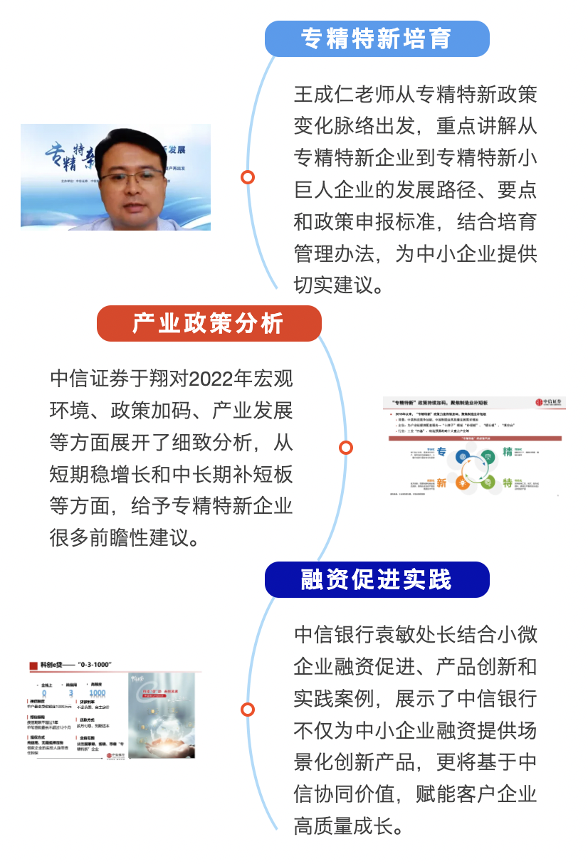 作為閉門會的“經(jīng)驗與知識干貨”環(huán)節(jié),會議邀請了中國國際經(jīng)濟(jì)交流中心科研信息部內(nèi)參處處長、副研究員王成仁老師、中信證券政策研究聯(lián)席首席分析師于翔老師以及中信銀行普惠金融部產(chǎn)品創(chuàng)新處袁敏處長分別帶來面向?qū)>匦轮行∑髽I(yè)培育管理、專精特新產(chǎn)業(yè)政策及宏觀分析、小微企業(yè)融資促進(jìn)與實踐分享的主題分享。