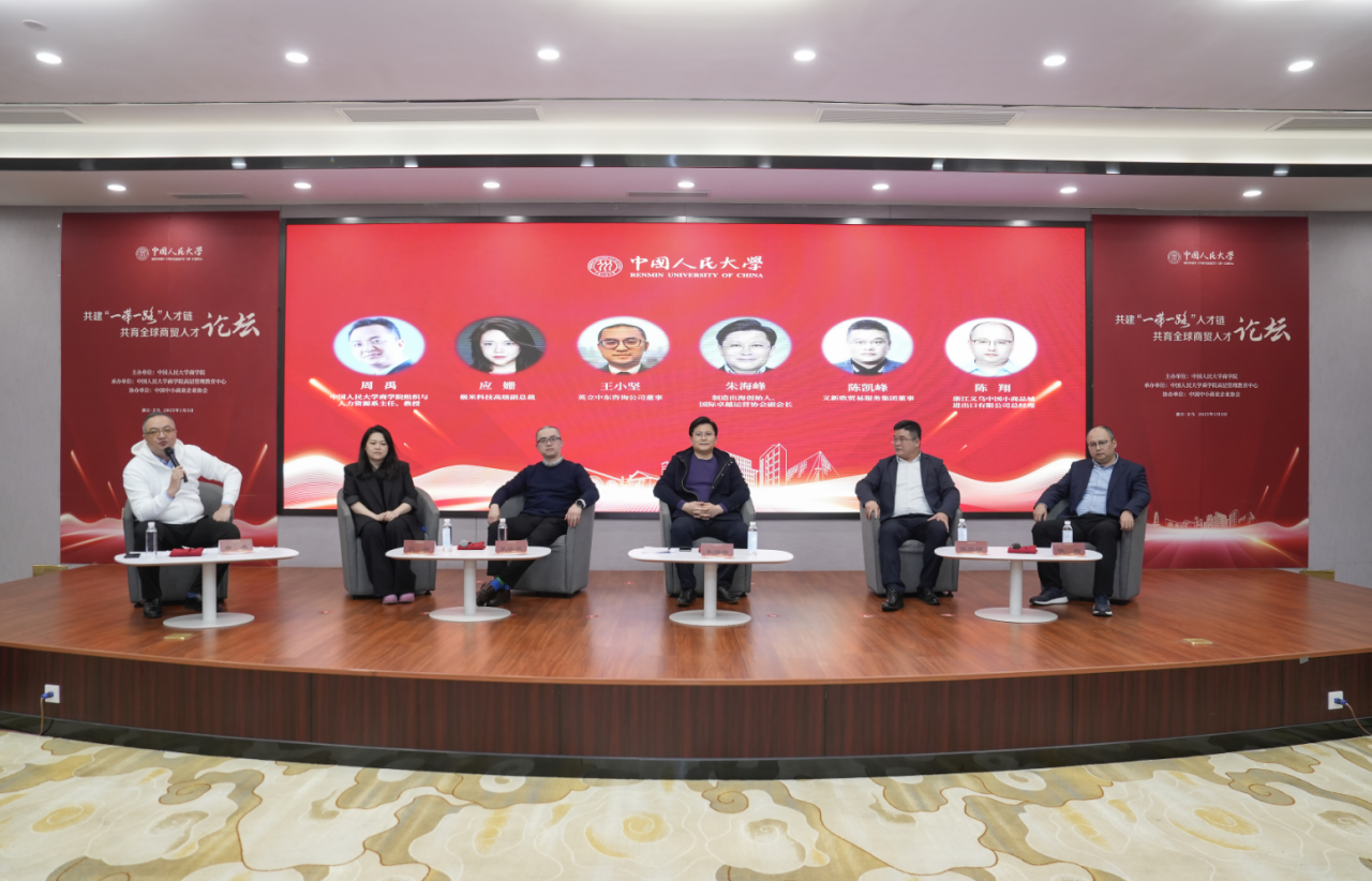 期間,由中國人民大學商學院主辦,商學院高層管理教育中心承辦,中國中小商業(yè)企業(yè)協(xié)會協(xié)辦的“共建一帶一路人才鏈,共育全球商貿(mào)人才論壇”在中共義烏市委黨校舉行,中國人民大學商學院院長易靖韜,黨委書記旋天穎,副院長張瑾;義烏市工商聯(lián)黨組副書記、副主席朱偉武,浙江交投人才發(fā)展集團有限公司黨委副書記、常務(wù)副總經(jīng)理吳紅艇,蔚來集團副總裁高崗,中國人民大學校友會,義烏當?shù)仄髽I(yè)及協(xié)會會員代表近百人參加。論壇由張瑾主持。本次論壇旨在探討共建“一帶一路”背景下的人才培養(yǎng)與商貿(mào)合作。