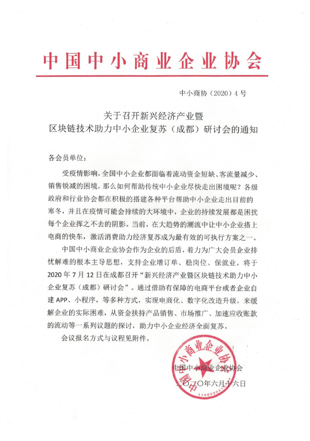 關(guān)于召開(kāi)新興經(jīng)濟(jì)產(chǎn)業(yè)暨區(qū)塊鏈技術(shù)助力中小企業(yè)復(fù)蘇(成都)研討會(huì)的通知