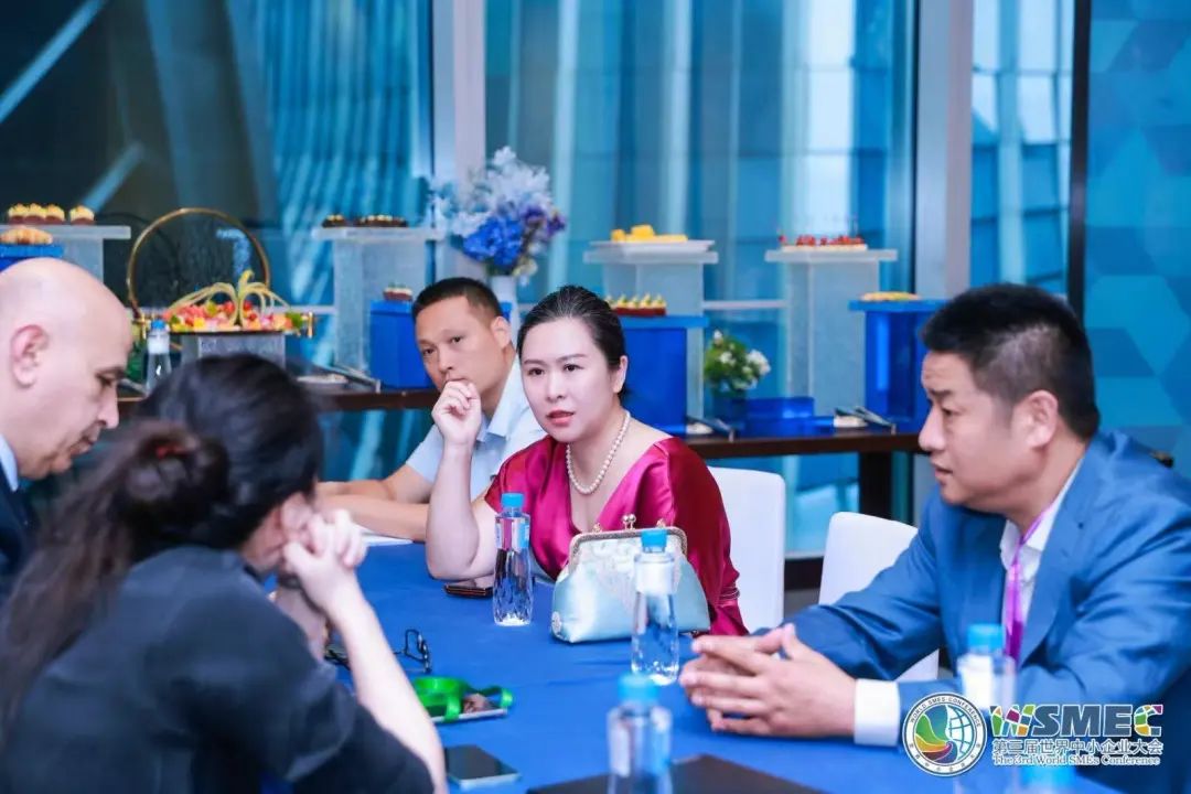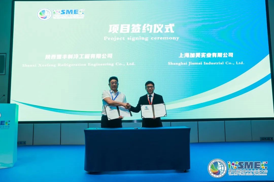 為促進(jìn)務(wù)實合作,大會特設(shè)自由洽談區(qū),并配備專業(yè)翻譯團(tuán)隊,助力企業(yè)高效溝通。據(jù)統(tǒng)計,超50家企業(yè)在現(xiàn)場開展一對一商務(wù)對接,涉及智能制造、綠色能源、跨境貿(mào)易等多個領(lǐng)域,達(dá)成多項初步合作意向。其中會員企業(yè)陜西雪豐制冷工程有限公司與上海加美實業(yè)有限公司在現(xiàn)場簽署潤滑油意向采購合作協(xié)議書。