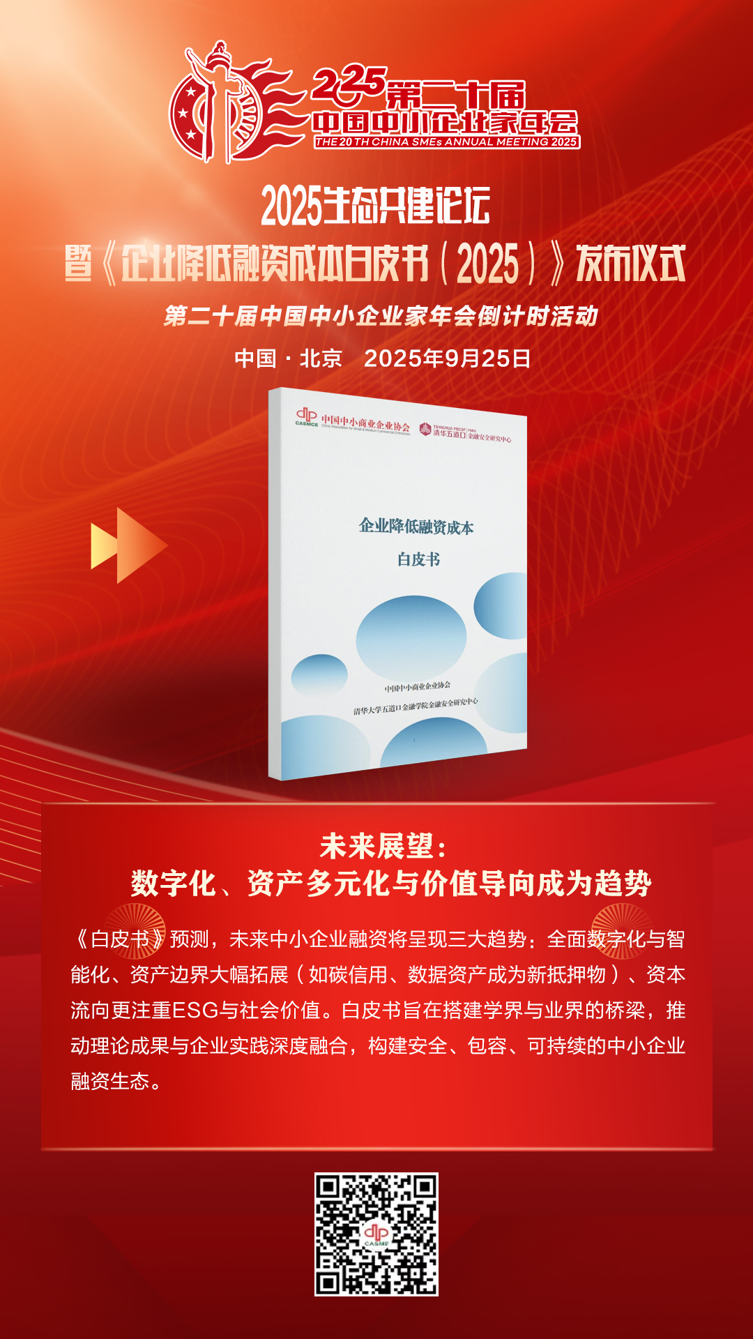 9月25日,第二十屆中國中小企業(yè)家年會倒計時活動——2025生態(tài)共建論壇暨《企業(yè)降低融資成本白皮書(2025)》發(fā)布儀式在北京舉行。清華大學(xué)五道口金融學(xué)院金融安全研究中心主任周道許與中國中小商業(yè)企業(yè)協(xié)會副書記陳建煌共同為《白皮書》揭幕。該《白皮書》發(fā)布,不僅為中小企業(yè)提供了實戰(zhàn)指南,也為政策制定者、金融機(jī)構(gòu)與科技平臺提供了協(xié)同創(chuàng)新的框架。